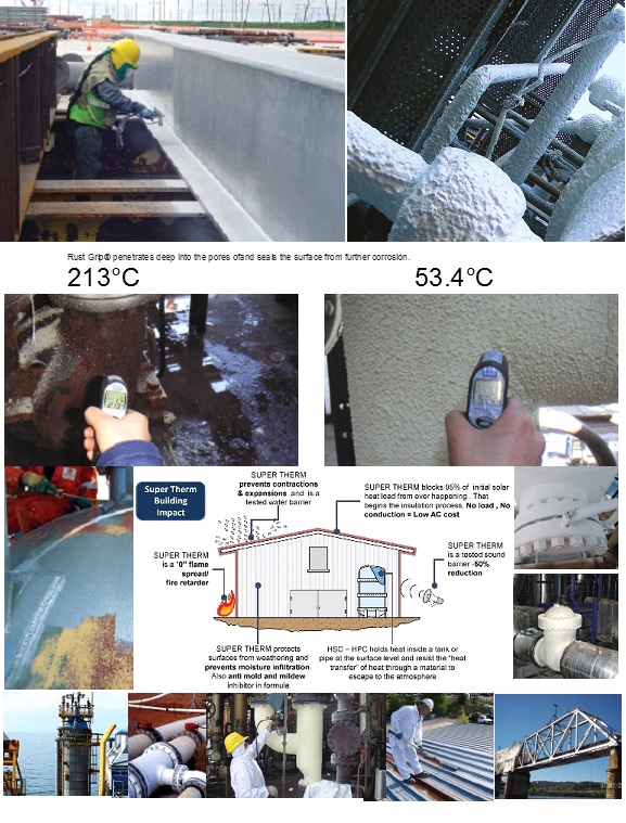 Super Therm® has four (4) ceramic compounds. Three of these compounds match the wave size of each of the solar radiation waves to block the heat load. The fourth ceramic has such low density that the heat cannot load into the surface of Super Therm® and therefore cannot be absorbed and transferred. This is why the surface of Super Therm® is not likely to be more than 2-10 degrees F over ambient air temperature in any climate. If heat load is blocked, there is no heat to be absorbed and transferred even when the surface becomes dirty. Super therm® can be applied on all external surfaces (Buildings, metal, masonry, wood, tar, concrete, aged foam, fiber glass, Vehicles, Tents, pipes, Tanks etc.). Field documentation shows no change in the performance of Super Therm® after 10 years, and only an 8% drop in blocking heat load after 15 years hence the product has 20 years performance warranty. ()